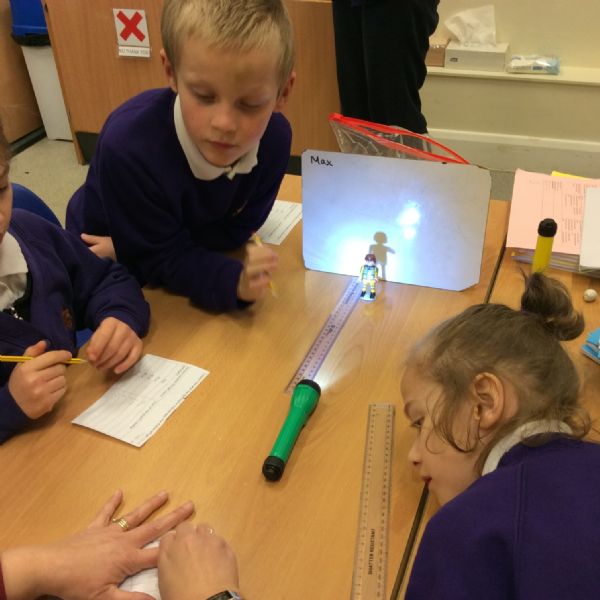 We set up a whiteboard to act as a screen then placed a little model person 10cms away from it. We held a torch a further 10cms from the model and measured how tall the shadow was. Then we moved the torch away at intervals of 10cms and measured the shadow each time.